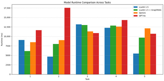 Comparing total runtime highlights a clear performance gradient across models, with GPT-4o generally incurring the highest computational cost, particularly in Task 2, where its response time peaked at over 17,000 ms. This is consistent with its large-scale architecture and the additional processing required for high-fidelity output. In contrast, the base LLaVA 1.5 model often produced the fastest responses, averaging lower runtimes across most tasks, albeit at the cost of increased hallucination frequency. Gemini showed moderate runtime efficiency, but its performance remained variable, likely due to unstable response generation in visually complex prompts. Meanwhile, LLaVA + GraphRAG, while often slower than the base LLaVA model due to the overhead of graph-based retrieval, remained within acceptable boundaries, especially given its strong gains in factual accuracy and hallucination avoidance. These results suggest a clear trade-off between inference speed and response quality, with the GraphRAG-augmented model offering a favorable balance for domain-specific applications where reliability is prioritized over raw speed. These results are shown below in Figure 11.