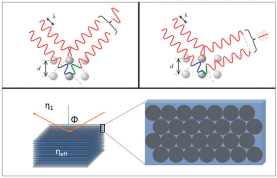 Schematic diagram demonstrating the interaction of light with the periodic material with an effective refractive index, and the light scattered by the sphere plains [5]. Copyright 2015, Royal Society of Chemistry, London, UK.