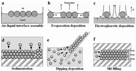 Illustration of different methods used for the assembling of 2D and 3D colloidal crystals. (a) air-liquid interface assembly (b) Evaporation deposition (c) Electrophoretic deposition (d) Sedimentation (e) Dipping deposition (f) Slit filling. Reprinted from Ref. [12]. Copyright 2013, Royal Society of Chemistry, London, UK.