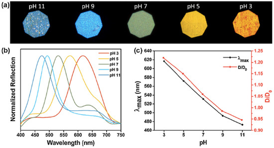 The detection of pH usually requires the use of IOHs [24,25,26,27]. A sensor produced by Zhao et al. [24] was designed to perform as a dual responsive HIO sensor, with structural colour change occurred at different pHs. Colours ranging from orange-red to yellow, dark green, indigo, and blue resulted when immersed in solutions of pH 3, 5, 7, 9, and 11, respectively, at a fixed temperature of 30 °C (see Figure 6), demonstrating a blue shift with increasing pH.