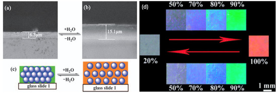 Humidity monitoring is important within various environments. Industries such as the pharmaceutical, health and food industries require the constant monitoring of humidity to prevent problems such as mould growth from occurring. Humidity is also important to monitor within a laboratory as it can influence the reliability of results. Over the last few years, a large amount of effort has gone into producing humidity detection techniques. So far, however, conventional detection methods usually work by receiving electrical signals, and consequently a challenge to produce a simpler and more stable sensor remains [28]. Optical detection due to a colour change offers one of the best alternatives to detect a change in humidity without complex data collection and a display unit. Once again, polymer hydrogels can be used for this purpose [28,29,30]. Tian et al. [28], for instance, infiltrated a PCC template consisting of monodisperse latex spheres of poly (styrene-methyl methacrylate-acrylic acid [P(St-MMA-AA)) with a diameter of 150 nm with an acrylamide (Aam) solution to produce a PCC hydrogel as a humidity-responsive sensor. Figure 7a demonstrates that when the humidity within an environment rises, the PCC hydrogel absorbs water and swells, resulting in a red-shift of the material. In addition, this PCC hydrogel sensor can undergo a reversible colour change, as when the humidity decreases, the PCC hydrogel will return to its original state (blue structural colour). Figure 7b illustrates the reversible colour changes at humidity levels from 20 to 100%.