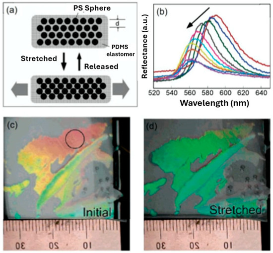 The detection of mechanical force is often required in areas where a structural change needs to be monitored, such as upon bridges and buildings. Due to the mechano-responsive properties of hydrogels, the capacity to effectively control a structural change can occur due to their ability to undergo a colour change in response to stretching. Mechano-responsive hydrogels are classified as materials which can adjust and adapt their physiochemical properties in response to applied mechanical force/deformation [18]. For instance, a PC hydrogel sensor was produced by Fudouzi et al. [31] by filling a 202 nm spherical PS PCC template with polydimethylsiloxane (PDMS). After swelling with silicone oil, a reversibly tuneable elastic-responsive PC hydrogel was achieved—see Figure 8. Figure 8a demonstrates that when the PC hydrogel is stretched horizontally, the size within the vertical direction is reduced, resulting in a decrease within the lattice spacing on the (111) crystal plane and inducing a blue shift within the material. Figure 8b shows that the diffraction peak blue-shifted from 590 to 560 nm, however with decreasing intensity, while Figure 8c,d demonstrate the visible colour change of the material before and after stretching.