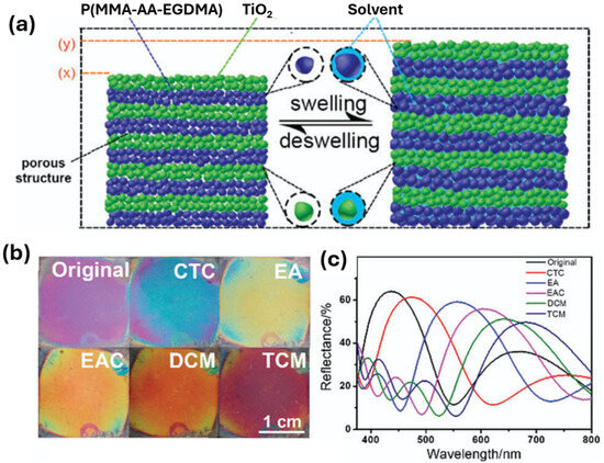 (a) The PCC produced by the layer-by-layer spin coating method (left), before and after being placed in an organic solvent. (b) Photographs of the 1D PCC sensor in different solvents, (c) The reflectance spectra of the sensor within different solvents. Reprinted from Ref. [45]. Copyright 2018, Royal Society of Chemistry, London, UK.