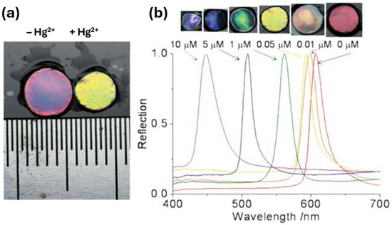 As can be seen in Figure 10, a large volume change occurred due to the binding of the aptamer to Hg2+ producing a blue shift. The concentration of the Hg2+ (Figure 10b) demonstrates the volume change in accordance with the concentration of Hg2+. The degree of the blue shift within the Bragg diffraction peak therefore could be used to estimate the quantity of the target ion. This sensor displays a high sensitivity and observable colour change within the material and has the potential to be used for the screening of a wide range of heavy metal ions within food, drugs, and the environment [53].