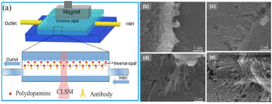 (a) Schematic diagram of the IO based on microfluidic chip. SEM Images of captured cancer cells on (b) flat glass, (c) pore size 250 nm, (d) pore size 305 nm, (e) pore size 415 nm IO structures Reprinted from Ref. [66]. Copyright 2017, American Chemical Society, Washington, DC, USA.