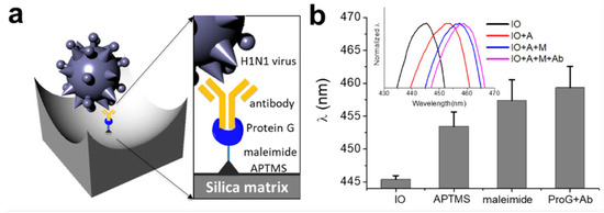 Influenza is an acute infectious disease caused by the influenza virus belonging to the Orthomyxoviridae family, which is divided into three types: influenza A, B, and C [68]. The fourth virus from the Orthomyxoviridae family is influenza virus D, which only affects animals with little known on its impact upon human health [69]. As it is a serious public health threat, a rapid diagnosis is required to prevent the spread of the disease. To address this problem, Lee et al. [68] developed an IO structure consisting of SiO2 for the immobilisation of the influenza virus antibody using chemical and biological linkers (see Figure 12). It was discovered that this SiO2-IO system successfully immobilised the H1N1 subtype when immersed within a dispersion of the viruses, leading to a red shift of the reflectance peak. Furthermore, it was found that the H1N1 was sensitively and selectively detected within a concentration range from 103 to 105 Plaque Forming Units (PFU).