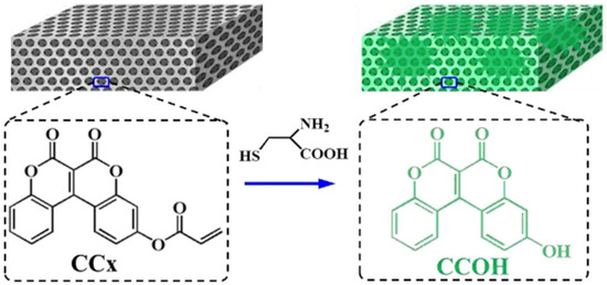 An illustration of the detection mechanism for the CCx IO films. The organic molecule CCx is adsorbed onto the microporous wall of the IO which reacts with cysteine to produce the fluorescent product CCOH when the CCx IO film is exposed to cysteine solution. Reprinted from Ref. [70]. Copyright 2023, Springer, Berlin/Heidelberg, Germany.