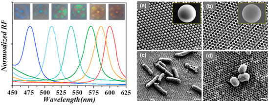 (left) Reflection spectra and optical images of the six kinds of hydrogel barcodes. SEM Images: (a) surface image of the SiO2 PCC template, (b) inverse opal barcodes, (c) the captured E. coli on the surface of the Apt-decorated IO barcodes, (d) the capture of the S. aureus on the surface of the Apt-decorated IO barcodes. The scale bars are 500 nm in (a,b), 2 μm in (c) and 500 nm in (d). Reprinted from Ref. [71]. Copyright 2018, Elsevier, Amsterdam, The Netherlands.