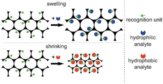 In the case of bioassays, HIOs which swell or shrink in response to changes of the hydrophilicity of the system are the most favourable methods used due to the binding of an analyte. Figure 15 demonstrates the swelling/shrinking properties of an HIO in response to a hydrophilic and hydrophobic analyte [72].