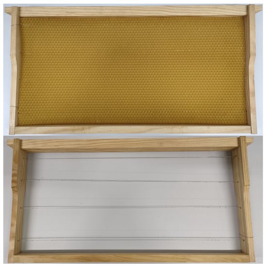 Each of the frames is composed of a wooden structure with outer dimensions of 44.5 × 23.5 cm, a thin layer of beeswax that serves as a guide for the bees to build their cells, and two metal wires running throughout the wooden structure to hold the beeswax layer. When beekeepers excite these wires with an electrical current, they serve as heaters, melting the beeswax and fixing it to the wires. A lateral view of a honeycomb frame is presented in Figure 2, with one frame with and one frame without beeswax to show the metal wires inside the structure.