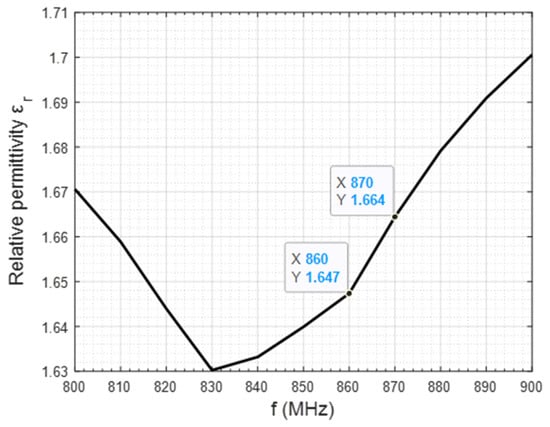 As our work frequency is fixed at 868 MHz, we take the closest permittivity value, located at 860 and 870 MHz, which is 1.65, rounded to the second decimal point. This value is then introduced into CST Studio to define the electrical permittivity of the material comprising the beeswax element.