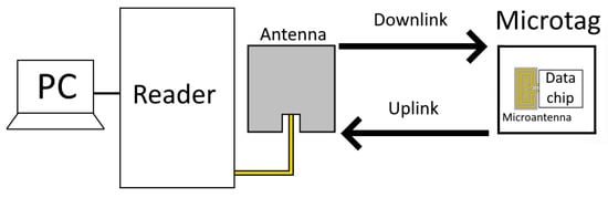 The passive tag receives the signal provided by the reader and backscatters it, provided that the received power is above its sensitivity of −22 dBm. When the backscattered signal is returned to the reader, it displays the tag name and RSSI value if the received power is above the reader’s sensitivity of −84 dBm. A diagram of the system is shown in Figure 5.