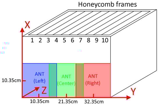 This study considers a beehive as the propagation environment, specifically a Dadant beehive, which consists of a wooden box that supports 10 honeycomb frames. The dimensions of the whole hive are 51 × 42.5 × 31 cm. Figure 1 gives a general overview of the beehive, showing that all frames can be viewed from the top.