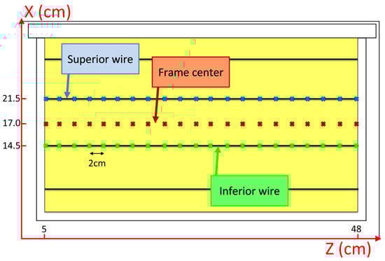 For each honeycomb frame inside the beehive, a total of 22 points, separated by 2 cm, were established. Three zones (superior wire, frame center, and inferior wire) were also distinguished in each frame: over the second wire from top to bottom (x = 20.5 cm), between the second and third wires (x = 17 cm), and over the third wire (x = 14.5 cm). This produced a total of 66 points in each frame, as shown in Figure 12.