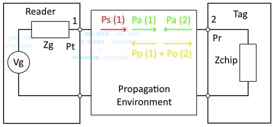where is the power received in the tag, is the power transmitted from the reader, and is the power accepted in the tag port. is the reference power in the ports, which is 1 W. Then, taking into account that is 31.5 dBm, the power received in the tag is