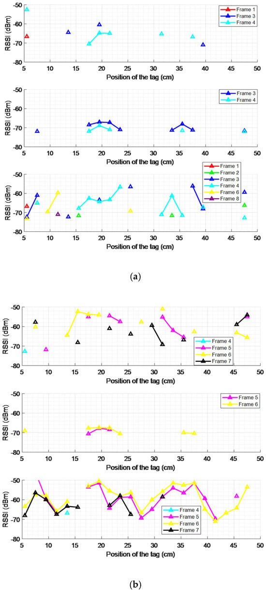 We can observe that the RSSI values are between −75 and −55 dBm in Figure 16a, −45 to −70 dBm in Figure 16b, and −50 to −70 dBm in Figure 16c. These values fluctuate and do not follow a shape comparable to the theoretical power received in the tag. This result was also observed in [16], which analyzed only a single honeycomb frame. However, some RSSI values can be seen in zones where the received power is maximum, even when it is not above the tag sensitivity. Similarly, some zones have no RSSI values in any case, corresponding to points where the theoretical power received is at a minimum.