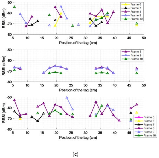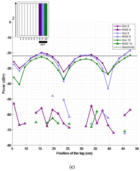 RSSI measurements and simulated received power versus the position of the tag, considering different frames, for the left (a), center (b), and right (c) reader antenna placements.