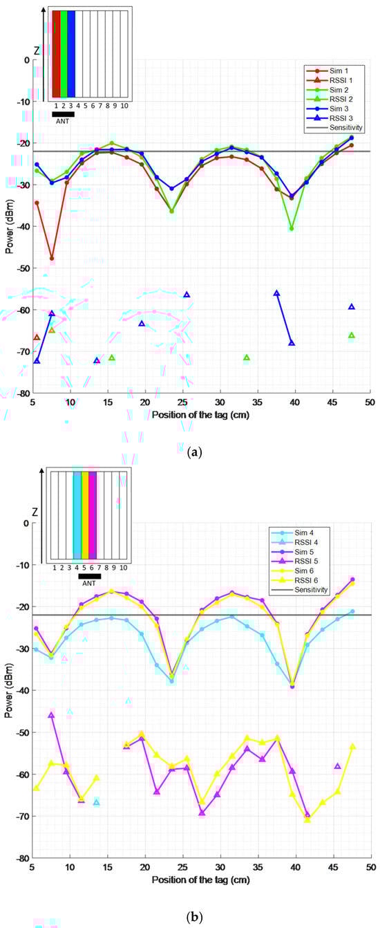 This relationship is fundamental to comparing results between simulations and RSSI measurements. Essentially, when the simulation provides a value of power in the tag over −22 dBm, we can check in the measurements whether an RSSI value was found for the same tag position.