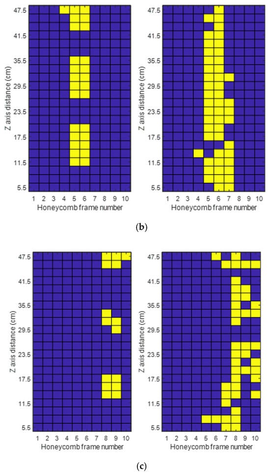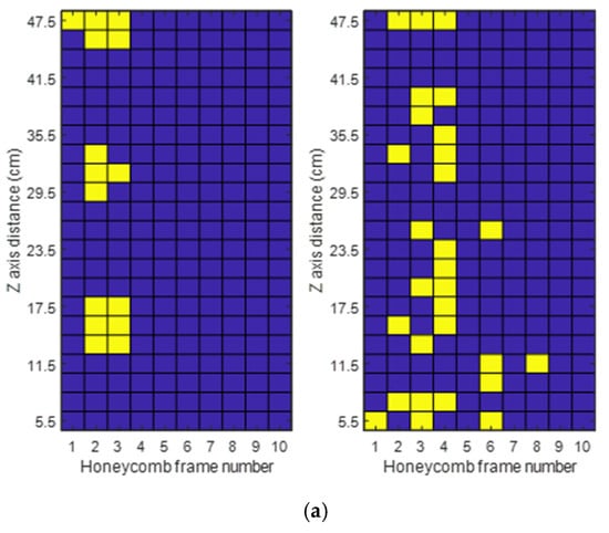Considering Figure 17a, we find that the simulation returns three different zones of coverage, covering mainly frames 2 and 3. The measured coverage provides a scattered pattern, covering mainly frames 3 and 4. However, more points of coverage are found throughout the hive, reaching a single point of coverage in frame 8.