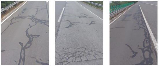 In the northwest region of China, asphalt pavement cracks are frequent and diverse [1]. Historically, due to economic constraints, crack filling has been a common treatment method as shown in Figure 1. Crack sealant, a material used for repairing cracks, is typically heated to a high temperature recommended by the manufacturer (usually around 193 °C) to become liquid, ensuring good adhesion and durability with the crack edges [2,3]. By filling the cracks, the pavement condition index (PCI) can be significantly improved in a short time. However, the lifespan of this treatment is generally short. Currently, the widespread use of hot in-place recycling (HIR) technology for recycling the surface layer of asphalt mixtures presents significant challenges when dealing with crack sealant [4,5,6]. During the heating process of old pavements, the variability in temperature due to uneven heating by the heating machine can be substantial. If the heating temperature is insufficient, the crack sealant does not revert to a liquid state but instead forms agglomerates [7]. For small areas of crack sealant, these agglomerates can be manually removed after heating, but this significantly slows down the construction process. However, if large areas of crack sealant are not pre-milled, repeated heating by the machine can cause the sealant (asphalt-based above 204 °C, silicone-based above 300 °C) to ignite, posing safety hazards. Therefore, accurately and effectively locating the position, type, and distribution of crack sealant during the pre-treatment process of origin pavements in HIR is crucial.