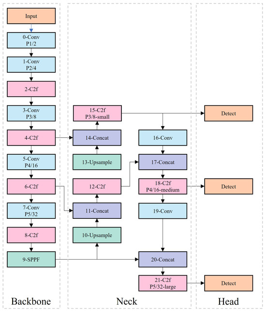 The network structure of YOLOv8s, shown in Figure 2, consists of four main parts: Input, Backbone, Neck, and Head.