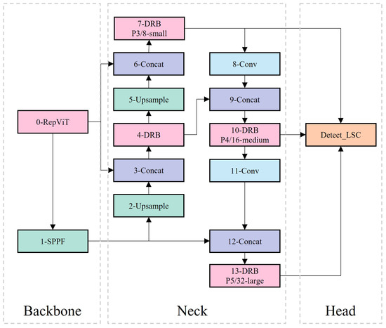This paper aims to achieve lightweight detection of sealant in the pretreatment process of HIR. To this end, a series of innovative improvements have been made to the YOLOv8s model as shown in Figure 3. Firstly, the RepViT backbone framework has been introduced, which enhances detection accuracy and reduces model complexity, thereby effectively decreasing computation time. RepViT enables the model to better capture feature information in the image, thus improving detection accuracy and achieving higher efficiency without additional computational burden.