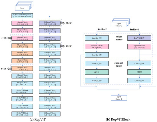 While YOLOv8 demonstrates strong performance in accuracy and speed, its computational complexity and parameter quantity may result in slow reasoning speed and high power consumption on resource-constrained devices such as mobile or embedded devices. Additionally, YOLOv8s relies on the Darknet-53 backbone framework, which includes 52 layers of convolution plus an output layer, for detecting asphalt pavement sealant. However, this high structural complexity can limit its flexibility in deployment. Furthermore, YOLOv8’s universal design may not be as effective as specially designed lightweight models when handling specific tasks. Particularly with high-resolution input images, YOLOv8 might struggle to capture small and intricate sealant features. To address these limitations, this paper introduces the RepViT network architecture in Figure 4. Drawing inspiration from the Transformer and ViT (Vision Transformer) concepts, RepViT leverages self-attention mechanisms and global feature modeling to capture global context information in road images, thereby enhancing detection accuracy and robustness [40].