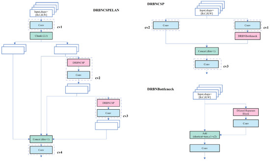 While the C2f module in YOLOv8s effectively leverages both detailed and semantic information for enhanced accuracy and robustness in pavement distress detection, its feature fusion operation escalates computational complexity and parameter count. Consequently, this elevates the time cost associated with model training and reasoning. To address this challenge, this paper introduces the DRBNCSPELAN module, replacing the C2f module, utilizing the Dilated Reparam Block and Generalized ELAN, as depicted in Figure 5.