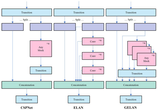 CSPNet is a network built upon stage-level gradient path-based architecture [41]. It divides the input into two segments via the conversion layer, processes them through any computational block, and subsequently reunites the branches through concatenation before passing them through the conversion layer again. Meanwhile, ELAN, a gradient path-oriented network, enhances the network’s gradient length by employing a stack structure within its blocks [42]. Through stacked convolution layers, each layer’s output is combined with the input of the subsequent layer for convolution processing. GELAN, inspired by CSPNet’s segmentation and reassembly concept and ELAN’s hierarchical convolution processing, integrates these elements into its design, allowing flexible utilization of computational blocks as shown in Figure 6 [23]. By facilitating efficient information flow and optimizing parameter utilization, GELAN reduces computing resource requirements while potentially enhancing detection accuracy and model generalization.