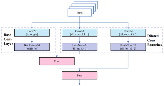 It captures fine-scale features via parallel small-core convolutional layers and sparse features via dilated convolutional layers, thereby enriching feature extraction efficiency. During training, these parallel branch convolution layers are each batch normalized (BN), and their outputs are aggregated. In the inference stage, structural reparameterization combines these convolutional layers and batch normalization layers into an equivalent large kernel convolutional layer, reducing computational overhead. A notable innovation of this module is converting dilated convolutional layers into non-expansive sparse large kernel convolutional layers. Specifically, by introducing zero entries into the convolution kernel, expanded convolution layers can be transformed into sparse non-expanded large kernel convolution layers. This approach preserves the effectiveness of original dilated convolutions while simplifying calculations during inference, achieved through transpose convolution. The integration of BN layers and dilated convolution layers enables the entire DRB to be converted into a single non-expanded large kernel convolution layer during inference, significantly boosting inference speed while maintaining efficient feature extraction.