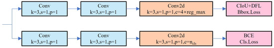 The Head part of YOLOv8s comprises two CBS convolution structures bifurcated, followed by a Conv2d operation as shown in Figure 8. Subsequently, classification loss and Bbox loss are computed separately. YOLOv8s adopts the Decoupled-Head structure to segregate classification and detection heads. Moreover, inspired by the Distributional Focal Loss (DFL) concept, the regression head’s channel count becomes 4 × reg_max (defaults: 16). Despite enhancing detection accuracy, the independent convolution operation employed for each detection layer’s feature map processing leads to redundant computational overhead. This approach underutilizes shared information within the feature map, thereby increasing the model’s computational cost. Additionally, during inference, the need to concatenate multiple convolution outputs and perform intricate post-processing escalates computational complexity and memory usage.