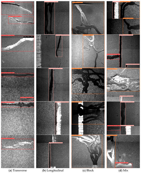 To assess the practicality of the YOLO-CS model in asphalt pavement HIR pretreatment, a visual analysis of crack sealant detection was conducted, as depicted in Figure 11. In Figure 11a, most of the transverse crack sealant detections exhibit confidence levels above 0.8. Notably, the micro-surface pavement enhances detection accuracy due to better background distinction. This type of crack sealant is typically employed for low-temperature transverse crack repairs or reflective cracks, with a wide distribution interval, making excavation and collection straightforward. Figure 11b illustrates the detection of longitudinal sealant, with confidence ranging from 0.7 to 0.9, effectively distinguished from cracks. This sealant addresses fatigue longitudinal or minor network cracks and is suitable for expansive construction cracks, requiring similar treatment measures to transverse sealant. In Figure 11c, block sealant is predominantly detected with confidence exceeding 0.9, largely unaffected by the pavement background. This type often necessitates milling during pretreatment due to structural pavement damage, where HIR alone cannot restore mixture performance. The dense distribution of such sealant poses manual handling challenges and risks fire hazards during heating. Figure 11d exhibits a mixed distribution of various sealant types. YOLO-CS accurately and promptly identifies and classifies sealants across diverse pavement backgrounds, significantly reducing human resource requirements. Its lightweight design facilitates deployment on mobile terminals, fostering engineering applications.