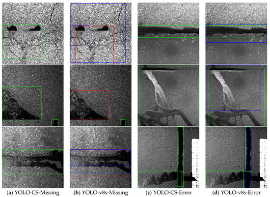To further compare the advantages of YOLO-CS over the YOLOv8s, the test set is analyzed. In Figure 12, correct detections are indicated by green boxes, missed detections by red boxes, and false detections by blue boxes. Analysis of Figure 12a,b reveals that when the surface lacks micro-surfaces, leading to low background discrimination, YOLOv8s struggles to differentiate cracks from block grouting glue, resulting in missed detections. YOLOv8s also misses bulk crack sealant in the second row and generates multiple prediction frames for transverse crack sealant, leading to missed detection. Conversely, YOLO-CS accurately locates the position and type of crack sealant. In Figure 12c,d, false detections in YOLOv8s are attributed to multiple prediction boxes for the same crack sealant, resulting in erroneous detection. YOLO-CS demonstrates superior learning and detection capabilities under varied conditions, accurately locating crack sealant positions with high confidence.