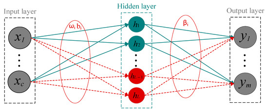 In Equation (1), is the activation function of the hidden layer, which is set to the sigmoid function in this paper. and represent the input weights and biases between the input node and the L-th hidden layer node, which are randomly assigned within the range . In Equations (2) and (3), is a scale factor. represents the maximum number of candidate nodes.