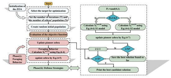 Zebra optimization algorithm (ZOA) is a novel bio-inspired algorithm proposed in 2022 []. This algorithm draws inspiration from the natural behaviors of zebras, simulating their foraging behavior and predator defense behavior. In contrast to well-known optimization algorithms such as particle swarm optimization (PSO), marine predator algorithm (MPA), and whale optimization algorithm (WOA), ZOA has the advantages of faster convergence speed and fewer parameters to set. The literature [] used the ZOA algorithm to optimize the weight parameters of residual network (ResNet)-CNN to enhance prediction performance. The literature [] proposed a ZOA-SNN hybrid model controller to meet load power demands, reduce harmonics, and improve power regulation in PV systems. However, like common bio-inspired algorithms, ZOA is also prone to the issue of easily falling into local optima, leading to the optimized objective parameters being suboptimal solutions, which might adversely influence the performance of the optimization model. In this paper, an improved zebra optimization algorithm (IZOA) is introduced, aiming to enhance the search capabilities of ZOA while avoiding its convergence to local optima. The several novel innovations and significant contributions of this paper are detailed below: