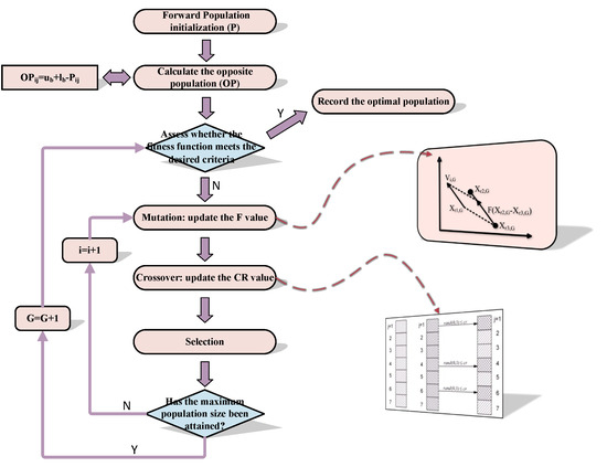 In order to improve the performance of the DE and overcome issues of premature convergence, integrating OBL into DE results in the ODE strategy, which can yield more suitable initial candidate solutions. The process of ODE is as follows (see Figure 4):