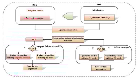 In the previous section, the basic ZOA process is presented. This section will present the improved methods for ZOA. The solution of ZOA is significantly influenced by the initial population distribution, and an uneven initial population distribution can impair its global search capability. Therefore, this paper employs Chebyshev chaotic mapping to improve the initialization phase of ZOA, which can shorten the convergence path, reduce ineffective searches in the early stages, enhance convergence efficiency, and mitigate the risk of local optima. As the search process progresses into the mid-phase, the fitness of the zebra population tends to stabilize or its diversity declines, at which point ZOA still remains susceptible to local optima. To avoid getting trapped in local optima, an opposition-based differential evolution (ODE) is introduced during the mid-phase search. Its mutation and opposition-based population generation mechanisms effectively disturb the current population, enabling ZOA to escape stagnation zones and further reducing the risk of local optima. In the late search phase, to avoid convergence oscillations and premature convergence while preventing ZOA from settling into suboptimal solutions, this paper adopts a nonlinear decreasing strategy to balance local exploitation and global exploration, thereby effectively enhancing convergence precision. In summary, the IZOA proposed in this study integrates Chebyshev chaotic mapping, ODE, and nonlinear decreasing strategy.