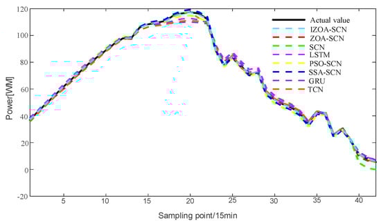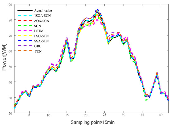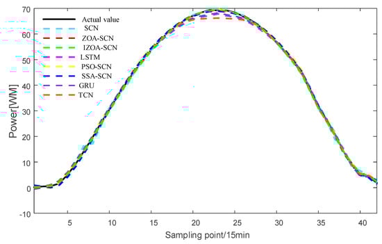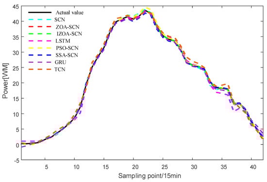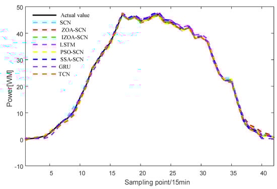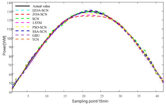 To enhance the generalization capability of the model, this study further validates the proposed IZOA-SCN algorithm using a dataset from a PV power station in northwest China []. After data processing and clustering, three distinct PV output patterns corresponding to different weather are identified: sunny, cloudy, and rainy patterns. The prediction results are presented in Figure 19, Figure 20 and Figure 21, with the corresponding evaluation indicators shown in Table 5, Table 6 and Table 7.