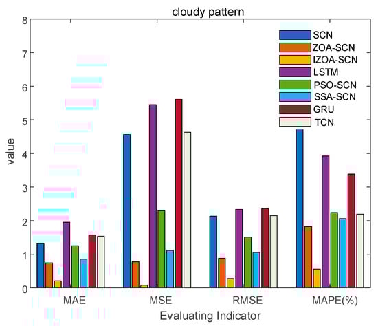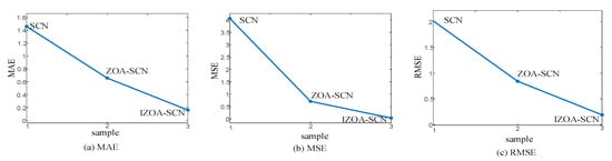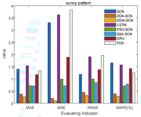 In this section, a series of ablation experiments will be conducted to demonstrate that each component of the proposed IZOA-SCN algorithm has a significant impact on PV power prediction results. Figure 22 and Table 14 present the ablation analysis results of the MAE, MSE, and RMSE for one-day PV power prediction.