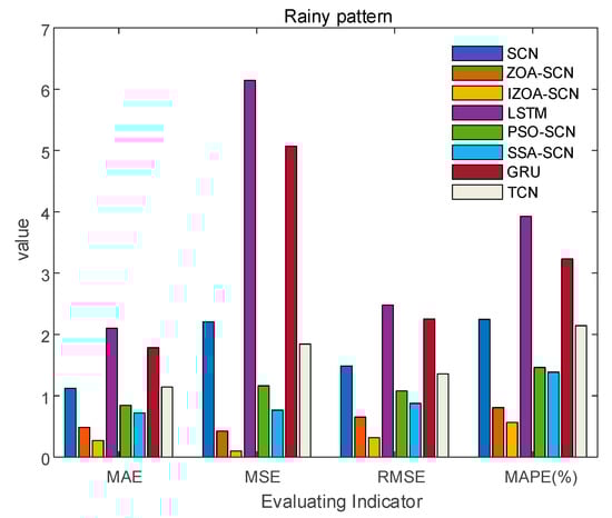 As shown in Figure 19 and Table 7, under sunny pattern, the LSTM, GRU, and TCN models all exhibit significant deviations in the peak power segment, while the SCN-based model demonstrates closer alignment with the actual values. The SSA-SCN and PSO-SCN models show improved prediction accuracy due to the incorporation of optimization algorithms but still exhibit fluctuations at certain points. In contrast, the ZOA-SCN model successfully overcomes limitations. Among all models, IZOA-SCN demonstrates the best fitting performance, which is further corroborated by its corresponding lowest evaluation indicator. As illustrated in Figure 20 and Figure 21 and Table 8 and Table 9, the models’ tracking capabilities face challenges under cloudy and rainy pattern, where frequent weather variations cause multi-point fluctuations in the actual values. Under these demanding conditions, the proposed IZOA-SCN maintains superior tracking performance and the lowest evaluation indicator among all compared methods. Therefore, the comprehensive simulation results conclusively demonstrate that IZOA-SCN effectively enhances the accuracy of short-term photovoltaic power forecasting.