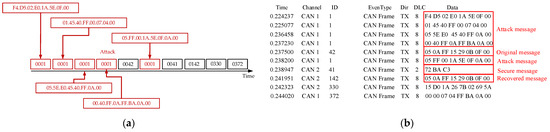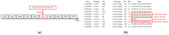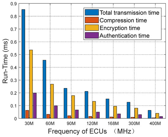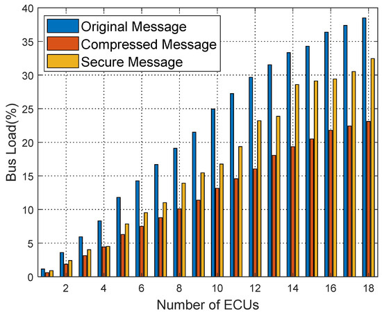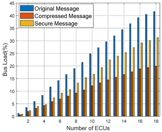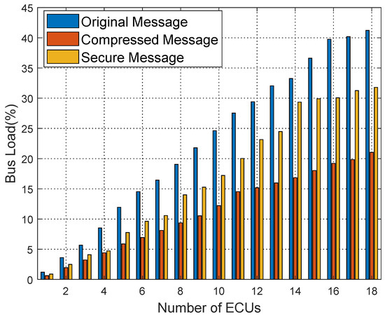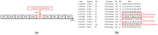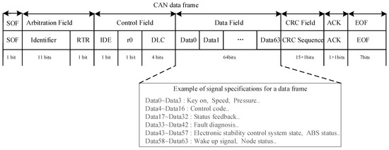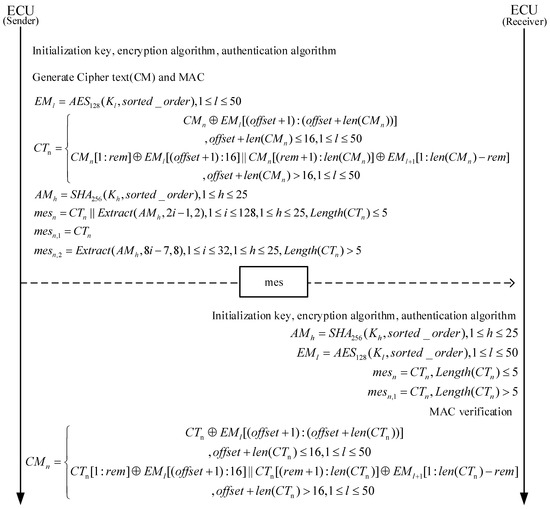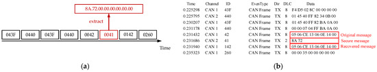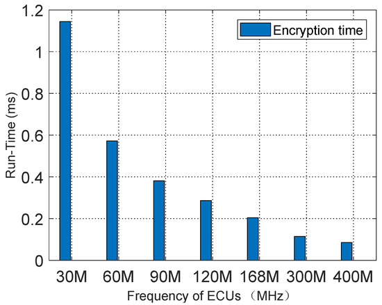 F is the maximum number of bits that can be transmitted in one frame. If the rate of the CAN bus is 1 Mbps, it will take 8.39 s to brute force the authentication code of 2 bytes after sending a message with a 128-bit frame including bit stuffing. If the authentication code selects 1 byte under the same conditions, the brute-force attack time is 0.0327 s. Therefore, we choose the authentication code of 2 or more bytes to be placed in the redundant position after encryption, which improves the security and does not need to place the authentication code on the CRC and extended ID to cause the normal work of CRC like [