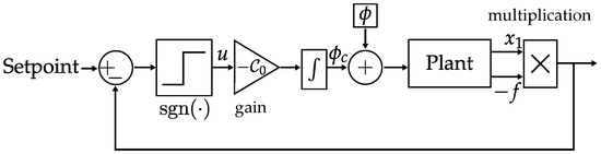 An example of a sliding mode control block diagram is shown in Figure 1, where the plant block represents the model of the system to be controlled. This is a simplified diagram based on the system that will be presented in detail in Section 2. The state variables and f are multiplied, the product is fed back, and it is compared with the setpoint. Thus, the switching mechanism (the sign function) generates a control signal u that is amplified by the gain and then integrated in time, providing . A disturbance in this diagram is represented by the signal , which is summed to the integrated control signal and inserted into the plant. In this work, we employed an SMO, which is a state observer based on the sliding mode control principles. In Section 2, the actual SMO used on the IFOG plant (which presents a raised cosine response, i.e., a nonlinear behavior) is presented in detail.