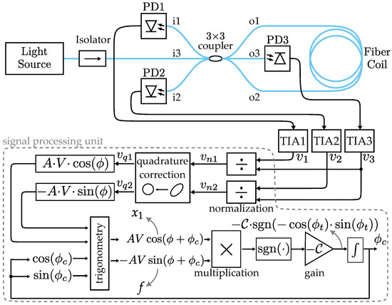 Therefore, the IFOG setup used in this work comprises a light source (superluminescent diode, SLD, mean wavelength nm, Inphenix IPSDD1508, Livermore, CA, USA), an isolator, a 3 × 3 optical fiber coupler, an optical fiber coil, three photodetectors (PD1, PD2, and PD3), and three transimpedance amplifiers (TIA1, TIA2, and TIA3), while the SMO system (implemented in a signal processing unit) contains the following blocks: normalization, quadrature correction, trigonometric calculation, sign function (sgn), gain (), and integrator, arranged as shown in Figure 2. Although the system can run in real time, as in Felão et al. [9], the TIA signals were logged using a signal acquisition module (NI-9230) with 24-bit resolution for ±30 V full-scale in an National Instruments cRIO-9053 platform, Austin, TX, USA. These voltage signals were sent to a computer, acting as the signal processing unit, used for post-processing.