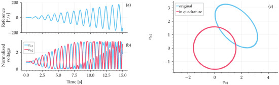 The fitted parameters in this work were the following: °, , , . By using these calibration parameters and (9) and (10), the original Lissajous ellipse is converted to a circle (in quadrature) centered at (0,0), as shown in Figure 4c. The code used here to simulate the SMO signal processing unit, including this ellipse fitting, is available as Code C1 from Supplementary Materials as a standalone Julia Programming Language package, version 1.7.