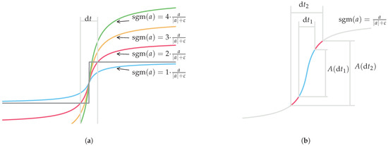 (a) Example of sigmoid gain difference compared with sign function. (b) Example of sigmoid gain difference due to sample rate.
