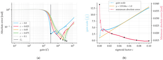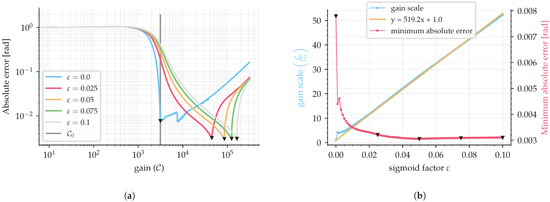 as a function of the control gain value, for a given sigmoid factor , thereby providing a respective curve, as shown in Figure 6a and Figure 7a. This curve presents a minimum absolute error point, where one can select the optimal control gain (point of minimum absolute error) for each sigmoid factor . The final transfer function of sigmoid gain tuning is then obtained by analyzing the optimal gains for different sigmoid factors for multiple sample rates.