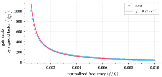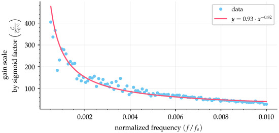 It is necessary to analyze the effect of the sampling period on the optimal gain. Note that Figure 6a and Figure 7a have different optimal gain values for the same sigmoid factor because different sample periods were used in the simulations. A faster sampling rate requires a higher gain because the sigmoid function is not instantaneous as the sign function, which results in a fraction of the gain value for the feedback loop, as shown in Figure 5b. To demonstrate this, 100 simulations with normalized frequencies ranging from to (500 Hz input signal with sampling periods from to ) were used to simulate curves of absolute error as a function of gain (as in Figure 6b and Figure 7b). Fitting the best line by least squares on these curves provided a slope value with information of gain scale () compared with the sign function by the value of the sigmoid factor (); then these slopes were used to make Figure 8.