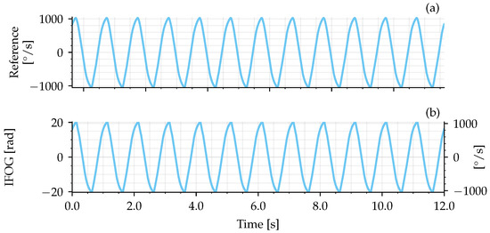 Rotation rate example signal recovered by IFOG-SMO. (a) Rotation rate imposed by the rotary table, measured with the table encoder. (b) Rotation rate measured with the IFOG-SMO.