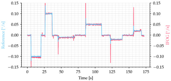 The second experiment was conducted by applying rotation rate in steps of , , , , , and +0.02°/s, as shown in Figure 11 by the blue line. The output signal (filtered by a 5 Hz second-order filter) is shown by the red line, where it can be noted the correct measurement of the small angular velocities applied to the IFOG-SMO.