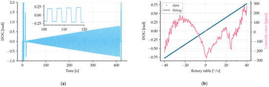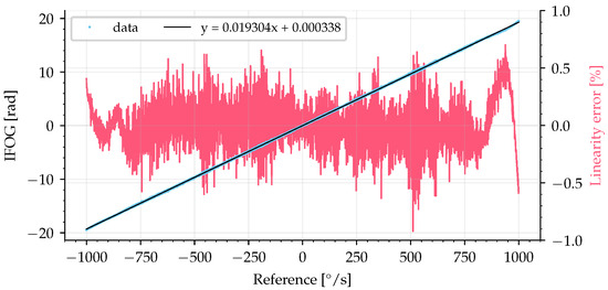 The linearity error had a maximum error of approximately 0.5%, equivalent to approximately 0.2 rad, in the interval from −1000°/s to +1000°/s. The code used for linearity error calculation is available as Code C2 from Supplementary Materials.